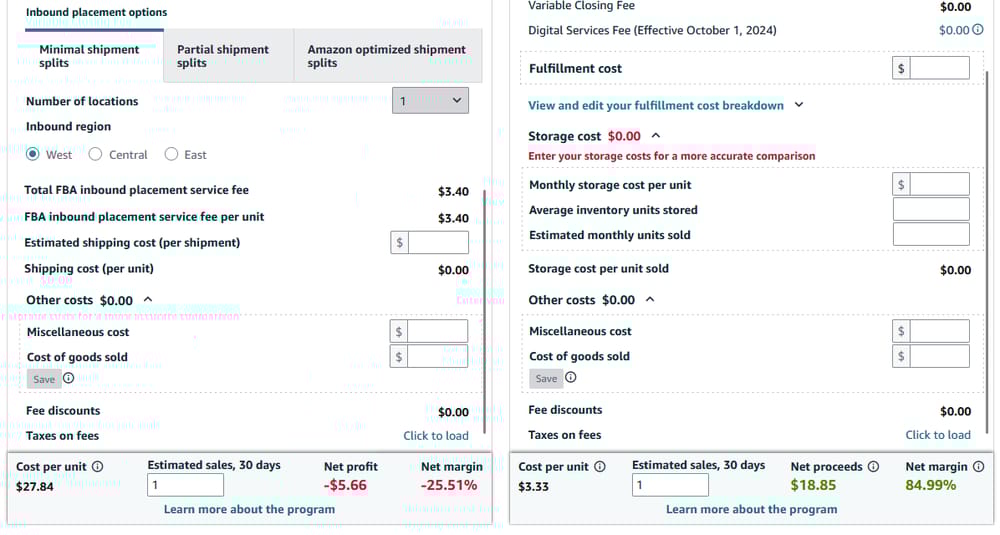 The calculator will allow you to review your item’s price, Amazon fees and costs, net profits, and net margins in order to compare costs, profits, and margins to get a sense of the revenue potential for each fulfillment method. You can also adjust the sale price of your item to help find the profit margin that best fits your needs. At the bottom of the calculator, you can change the “Estimated sales” number to see what your net profit and margin would be if you were to sell that quantity.