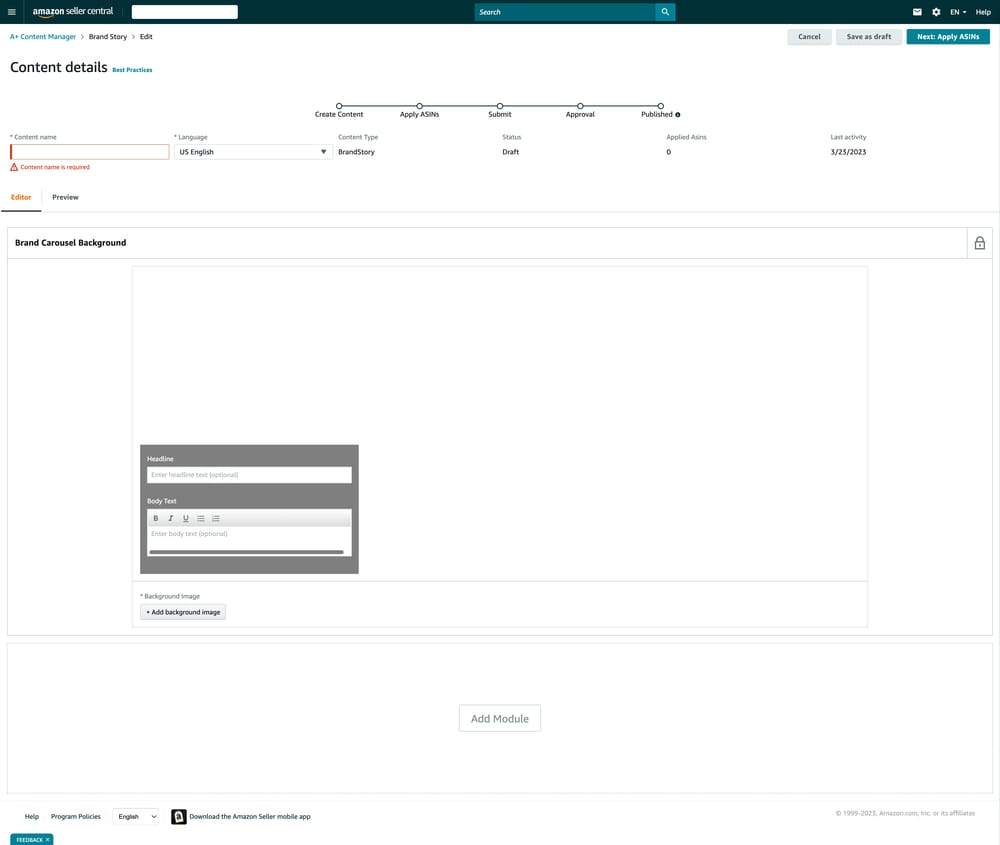 To access the Brand Story feature, sellers must be registered in Amazon's Brand Registry program and have an active brand on Amazon. The feature is available to sellers in certain Amazon marketplaces, including the US, UK, Canada, Mexico, Germany, France, Italy, Spain, and India.